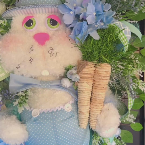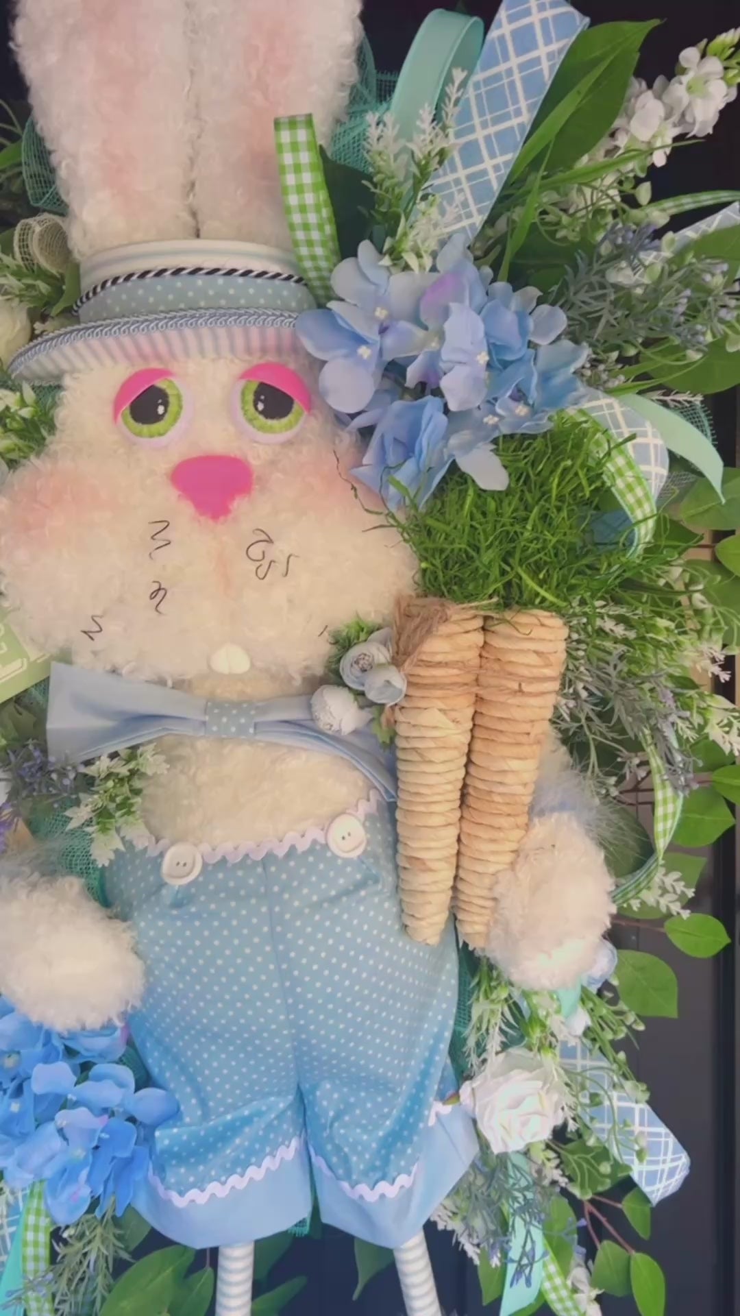 "He’s dressed to impress! 💙🐰 Check out the newest addition to the shop—this blue bunny is ready for Easter in his polka-dot overalls! He’s surrounded by lush greens, hydrangeas, and holding his own carrots. A perfect way to welcome spring.